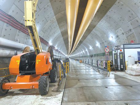 走進(jìn)項(xiàng)目工地,沒(méi)有想象中的機(jī)械轟鳴聲,施工現(xiàn)場(chǎng)位于幾十米深的地下。記者從地面乘坐直梯,順著盾構(gòu)機(jī)始發(fā)井,來(lái)到地下26米處的西線隧道內(nèi)。國(guó)產(chǎn)最大直徑泥水平衡盾構(gòu)機(jī)“京華號(hào)”,已在西線隧道里向前掘進(jìn)了近4000米。眼前的西線隧道,蜿蜒著向南延伸。開(kāi)工初期,記者從始發(fā)井步行幾分鐘即可抵達(dá)盾構(gòu)機(jī)駕駛艙位置;這次采訪,施工方特意安排了1輛純電動(dòng)代步車。“現(xiàn)在盾構(gòu)機(jī)離始發(fā)井有些遠(yuǎn),工作人員上下班都得坐車。”駕駛員說(shuō),這輛電動(dòng)代步車是用吊車吊到隧道內(nèi)的,還特意為它在隧道里安了充電樁,“這輛車再回到地面,就得是隧道貫通的時(shí)候啦!”