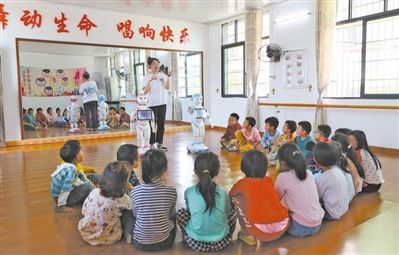湖南新田縣彭梓城村小學,老師指導孩子使用智能教育機器人進行編程和學習。