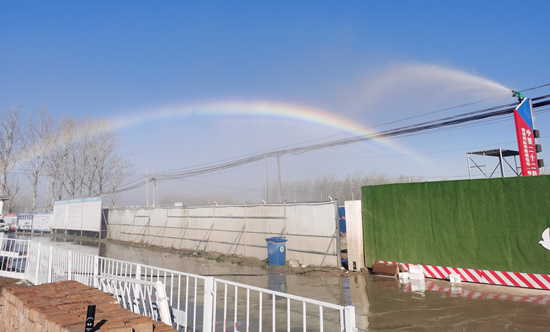 針對項目施工的這些特點,項目部自主研發了高壓抑塵消防霧炮裝置,該裝置平時主要是抑制揚塵,凈化空氣,遇到火災時還是重要的消防工具。