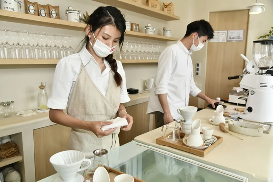 如今,Lily的兩家店一共12名員工,其中7名是“聾人”。在老板細致的介紹下,王愛芬了解了咖啡店的運營狀況和“聾人”的用工比例,對店內兩位“聾人”服務員的沖泡咖啡的手法也是贊不絕口。