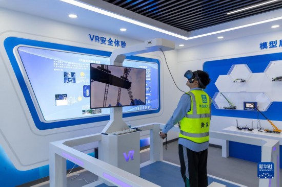 工作人員在雄安新區一智慧工地展示廳進行工地VR安全體驗(2022年4月13日攝)。新華社發(高盟 攝)