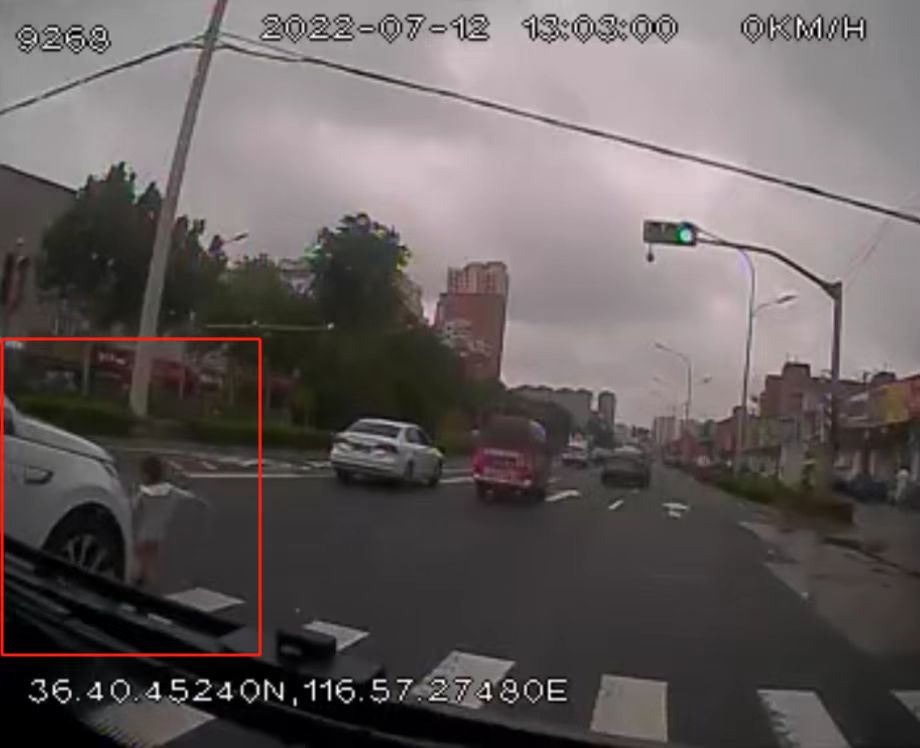 車載監控畫面顯示,路口正值綠燈,一位4歲左右的兒童突然從斑馬線上跑出,橫穿馬路。危急時刻,開在道路最右側車道的濟南公交B120路駕駛員張濱迅速踩下剎車,在公交車停下的同時,張濱為提醒其它車輛注意到在駕駛視線盲區的兒童,趕緊將手伸出窗外不停揮舞、呼喊。