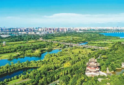 圖一:藍(lán)綠交織的永定河北京豐臺段。本報(bào)記者 賀 勇攝