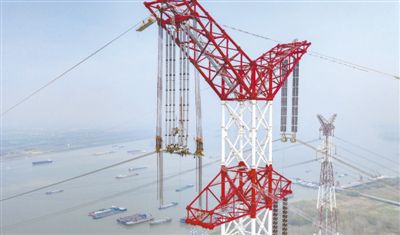 對于白鶴灘—江蘇工程安徽段的建設者來說,讓導線順利跨越2500米寬的長江蕪湖段,無疑是最大挑戰。為了保證導線與江面的安全距離,兩岸主跨越塔設計高度達278.2米、接近100層樓高,重量達2200多噸,這是全線路跨度最大、塔身最高、單基最重的跨越塔。安徽段長江大跨越施工隊隊長韓仲瑞介紹:“僅與塔腿段連接的單根塔管就重17噸,連接處由26個螺栓固定,每個螺栓重35斤,這樣的螺栓全塔大概需要2000個,都必須嚴絲合縫地對接上。”