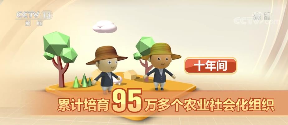十年間,累計培育95萬多個農業社會化組織,服務面積近17億畝次,服務帶動小農超過7800萬戶。全國農作物耕種收綜合機械化水平從57%提高到72%以上,水稻、玉米、小麥三大糧食作物機械化率分別超過85%、90%和97%。