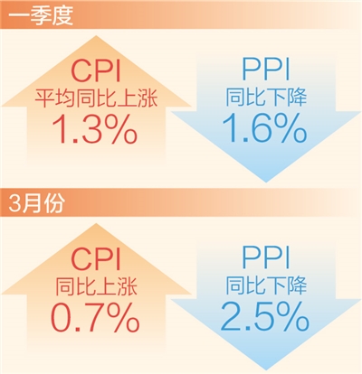 本報北京4月11日電 (記者劉志強)國家統(tǒng)計局11日發(fā)布數(shù)據(jù)顯示:3月份,CPI(居民消費價格指數(shù))同比上漲0.7%,漲幅比上月回落0.3個百分點;PPI(工業(yè)生產(chǎn)者出廠價格指數(shù))同比下降2.5%,降幅比上月擴大1.1個百分點。從一季度看,CPI平均同比上漲1.3%,PPI同比下降1.6%。一季度CPI持續(xù)運行在合理區(qū)間,物價保持平穩(wěn)運行,為全年物價穩(wěn)定奠定了堅實基礎(chǔ)。