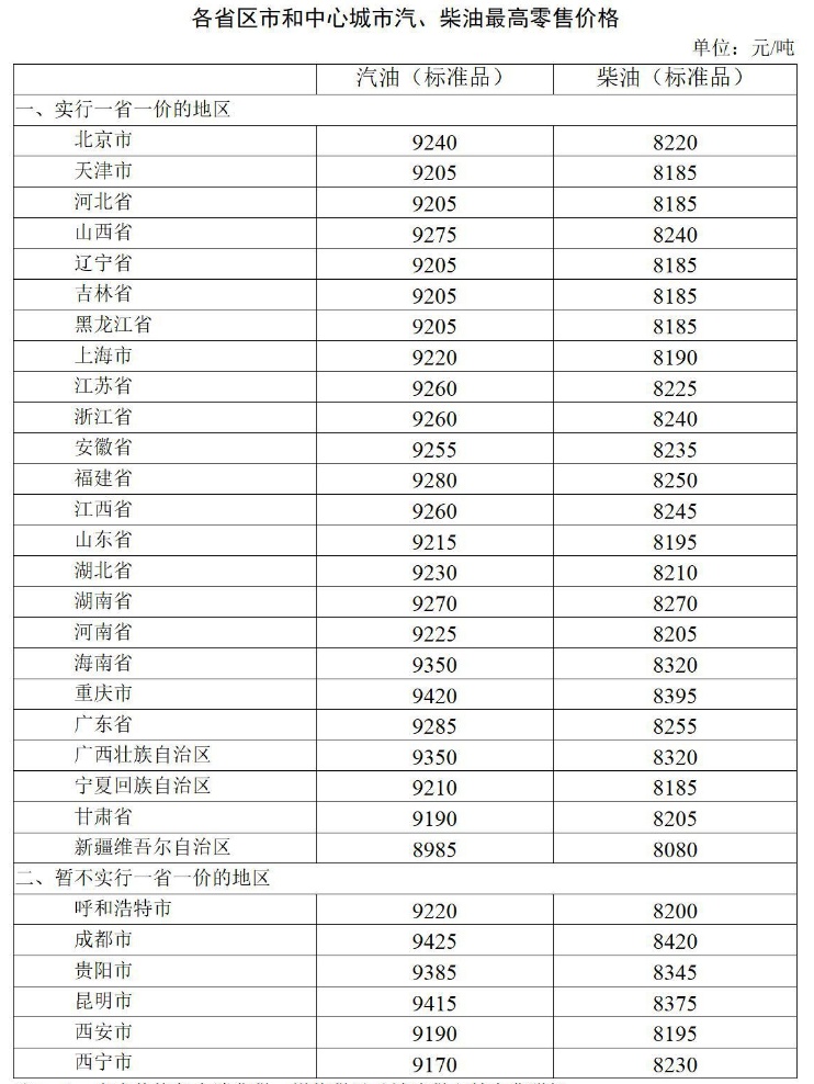 附:各省區市和中心城市汽、柴油最高零售價格