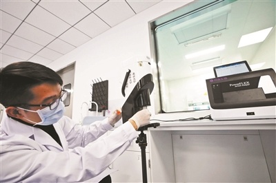 昨日,北京青年報記者在北京中關村生命科學園生物氣溶膠檢測實驗室內見到了這套生物氣溶膠新冠病毒核酸監測系統,它由兩部分組成:便攜式氣溶膠采集器和一體化高靈敏新冠病毒核酸檢測儀。其中,氣溶膠采集器由北京大學環境學院要茂盛團隊前期開發完成,空氣流量達到400升/分鐘,顆粒收集切割點為0.58微米,病毒富集效率高,為國內同類產品最高。