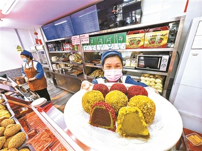 寒食節(jié)有踏青出游、放風(fēng)箏等民俗活動(dòng),護(hù)國(guó)寺小吃“寒食十三絕”中的蜜麻花,形似風(fēng)箏,有著寒食吃蜜麻花耳聰目明的寓意;而像姜汁排叉,在春寒尚未退卻之時(shí),以姜汁暖胃,加之春季宜食甜,所以也成為護(hù)國(guó)寺小吃寒食中的銷(xiāo)量冠軍。在護(hù)國(guó)寺小吃起源店,為了方便市民購(gòu)買(mǎi),護(hù)國(guó)寺小吃的“寒食十三絕”堅(jiān)持套裝售賣(mài)和零售,經(jīng)理王新梅介紹,“像里面的姜汁排叉、蜜麻花的銷(xiāo)量幾乎能占到十三絕銷(xiāo)量的四成左右,最受歡迎。”