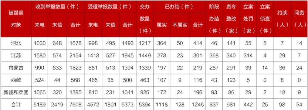 截至4月10日22時,各督察組共收到群眾來電、來信舉報7608件,受理有效舉報6373件,經梳理合并重復舉報,累計向被督察對象轉辦5394件;被督察對象已辦結或階段辦結2083件,其中立案處罰442家;立案偵查25件;約談黨政領導干部98人,問責黨政領導干部54人。