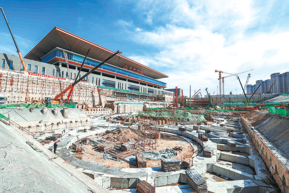 北京朝陽站交通樞紐項目14日完成雙環(huán)梁板混凝土澆筑。本報記者 潘之望攝
