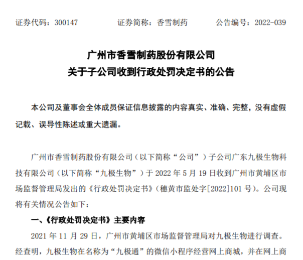 央廣網北京6月6日消息(記者 苗雁)近日,香雪制藥全資控股子公司廣東九極生物科技有限公司(以下簡稱“九極生物”)因宣稱其果味飲品“天資韻膠原蛋白果味飲品”,能養顏護膚、豐滿胸部、預防疾病、預防骨質疏松等,被廣州市黃埔區市監局認定涉嫌虛假宣傳,被處以罰款25萬元。