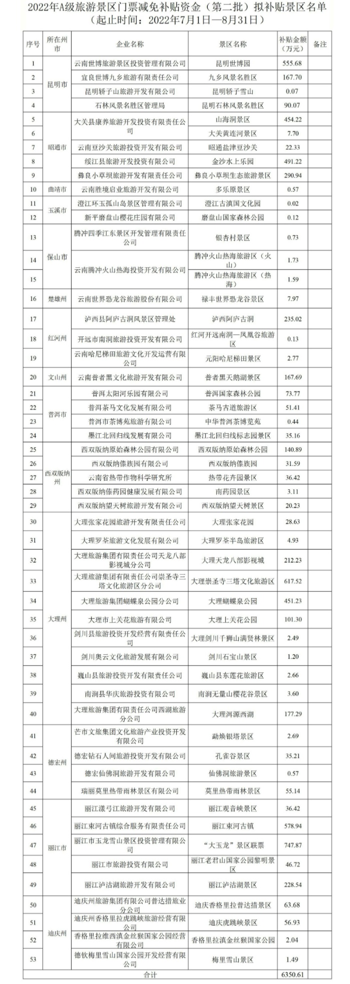 云南省公布2022年A級旅游景區門票(第二批)擬補貼景區名單