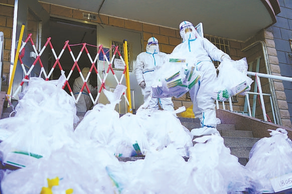 近日,朝陽區東湖街道利澤西園一區社區“大白”逐戶為封控居民送抗原試劑盒,分發蔬菜包等生活必需品。 本報記者 程功攝
