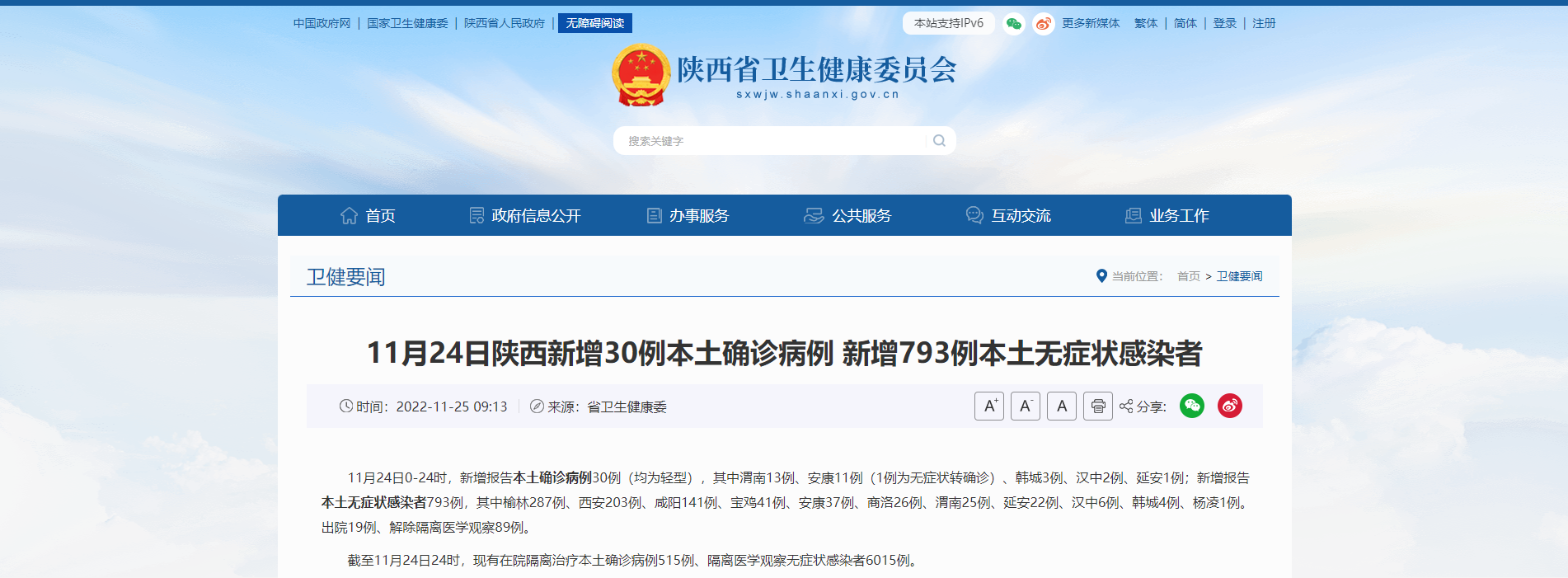 截至11月24日24時(shí),陜西現(xiàn)有在院隔離治療本土確診病例515例、隔離醫(yī)學(xué)觀察無(wú)癥狀感染者6015例。