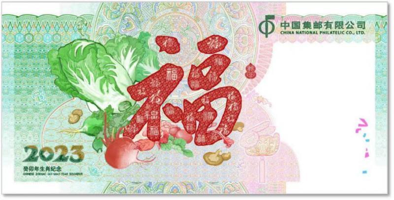 紀(jì)念券背面主景采用多個“福”字的組合,寓意著新的一年福氣連連、福滿門。背景團(tuán)花中有玉兔搗藥的圖案,表達(dá)了疫情之下祈求健康、幸福的真摯愿望。白菜、蘿卜、蘑菇也都有著各自的深意,比如白菜諧音“百財(cái)”,且有清白之意;蘿卜在閩南方言叫“菜頭”,諧音彩頭;蘑菇則象征蓬勃向上的生命力量。這些看似普通的元素給人以親切之感,更寓意著源源不斷的財(cái)運(yùn)、好運(yùn)和幸運(yùn)。