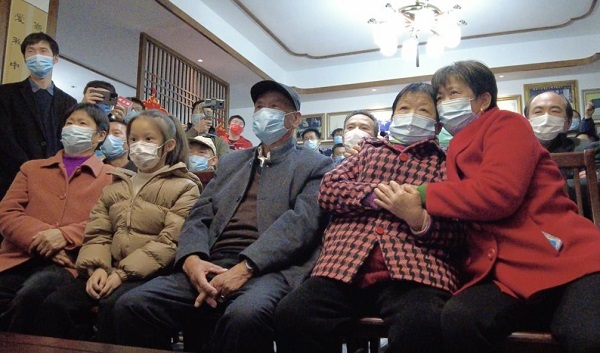 費俊龍的老同學們一起看老照片,回憶舊時光(央廣網記者鄭楚豫攝)