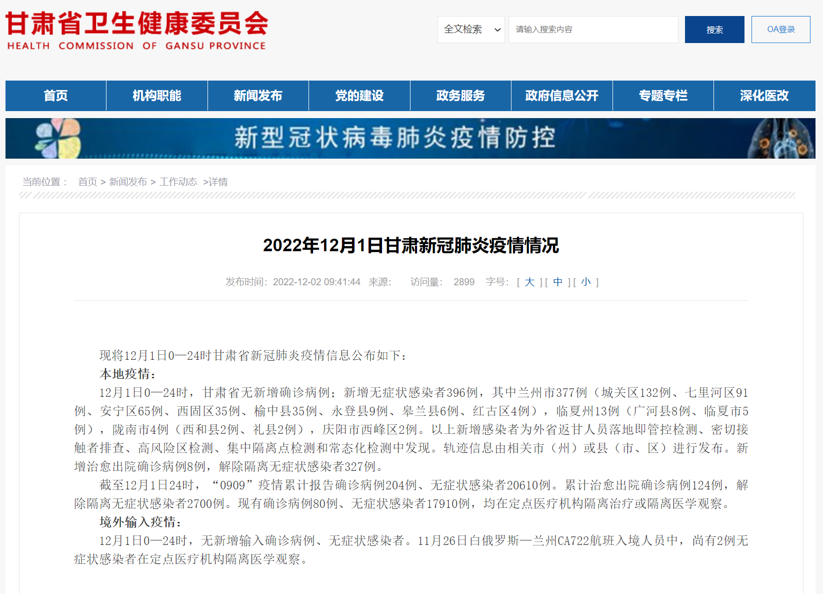 央廣網蘭州12月2日消息(記者邸文炯)據甘肅省衛健委通報,12月1日0—24時,甘肅省無新增確診病例;新增無癥狀感染者396例,其中蘭州市377例(城關區132例、七里河區91例、安寧區65例、西固區35例、榆中縣35例、永登縣9例、皋蘭縣6例、紅古區4例),臨夏州13例(廣河縣8例、臨夏市5例),隴南市4例(西和縣2例、禮縣2例),慶陽市西峰區2例。以上新增感染者為外省返甘人員落地即管控檢測、密切接觸者排查、高風險區檢測、集中隔離點檢測和常態化檢測中發現。軌跡信息由相關市(州)或縣(市、區)進行發布。新增治愈出院確診病例8例,解除隔離無癥狀感染者327例。