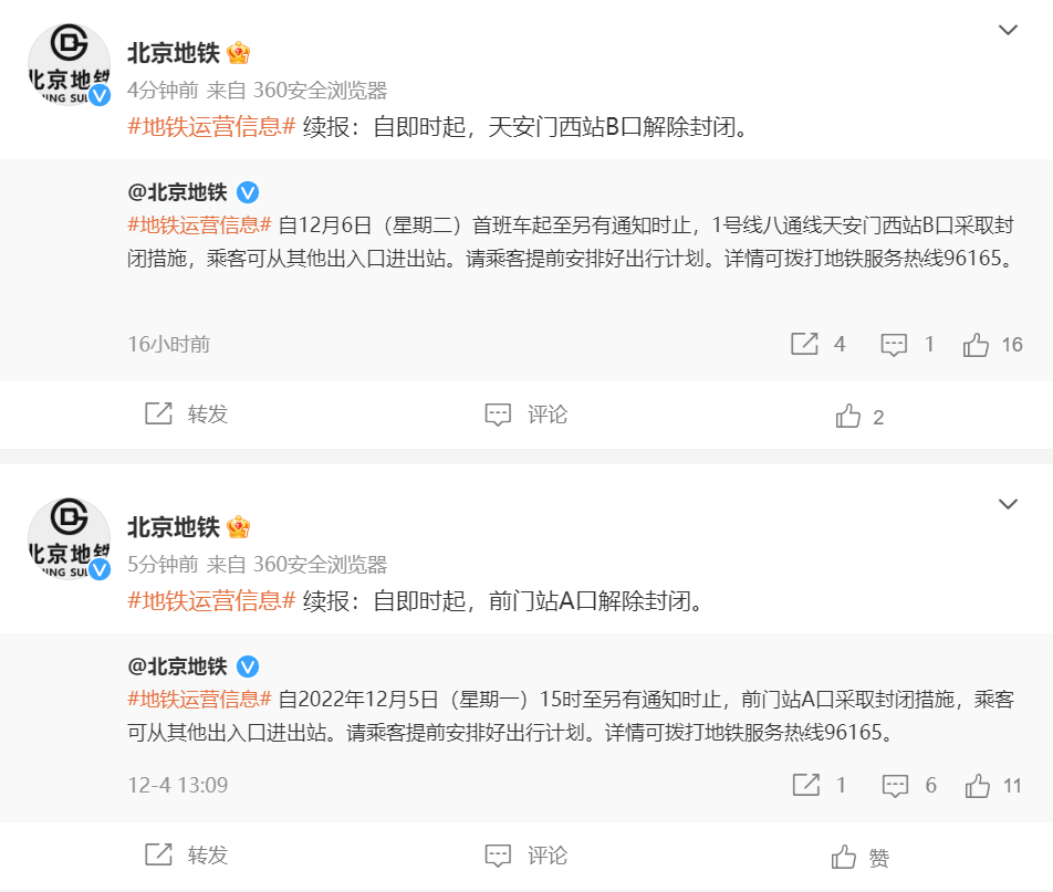 據@北京地鐵 微博消息,1號線八通線前門站A口、天安門西站B口解除封閉。