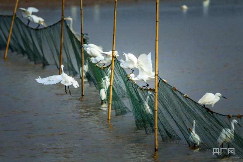 白鷺追逐在湖畔淺灘,捕食著可口的小魚小蝦(央廣網發 陳扶南 攝)