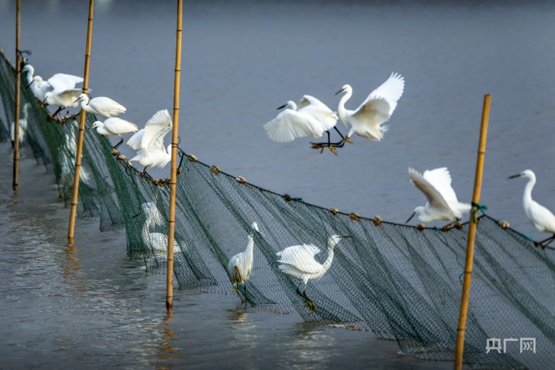 央廣網都昌12月13日消息(記者鄧玉玲)時值冬日,在江西鄱陽湖都昌磯山湖濕地,仍然活躍著近千只夏候鳥白鷺,它們追逐在湖畔淺灘,守候在隔離網周邊,捕食著可口的小魚小蝦,享受著候鳥家園的歡樂。