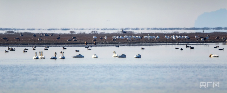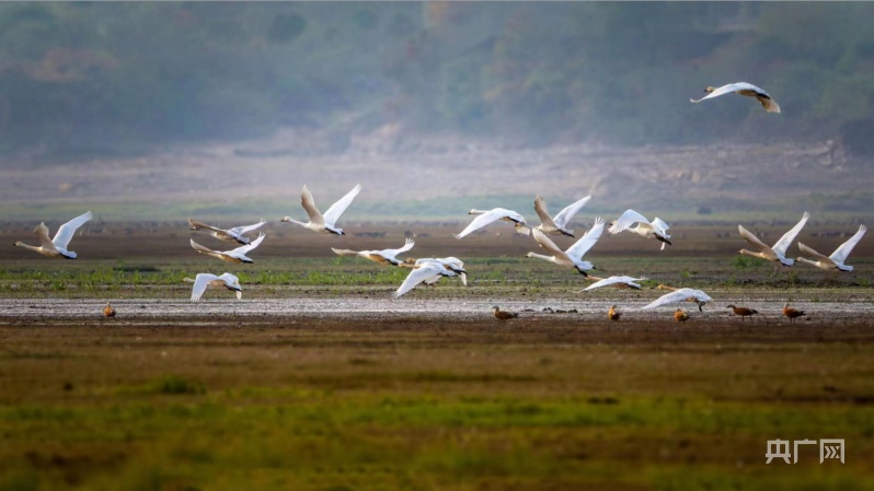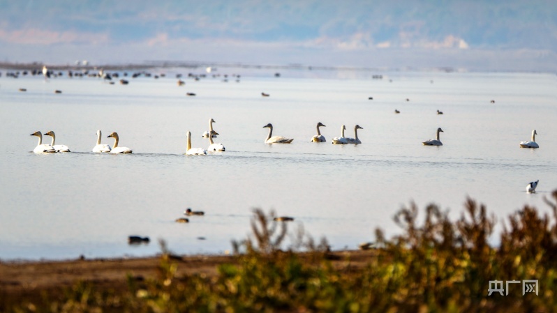 數百只小天鵝自由自在地徜徉于湖畔淺灘(央廣網發 陳扶南 攝)
