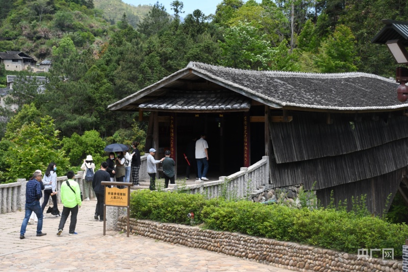 游客參觀下黨鄉(xiāng)古廊橋“鸞峰橋”(央廣網記者 龔雯 攝)
