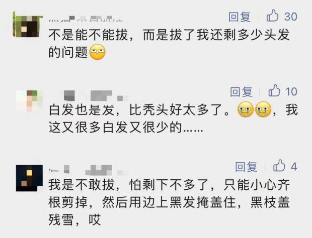 一些人在壓力較大時,可能會將疼痛感轉化為某種獲得感,在一定程度上緩解焦慮。但更多人是從拔白頭發這件事當中獲得一種視覺上的自信——似乎又回到了頭發烏黑的時代。