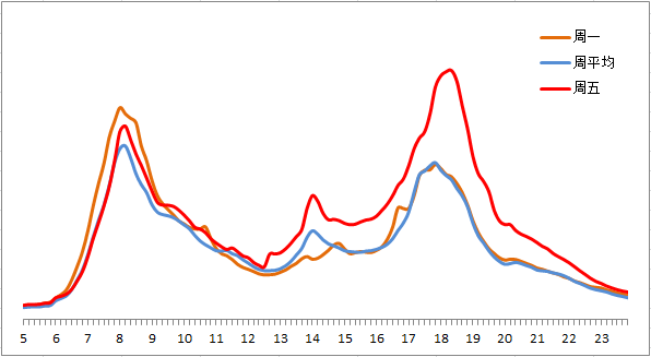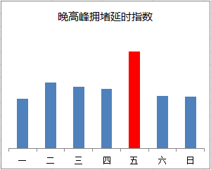 晚高峰期間,東、西、北二、三、四、五環(huán),東六環(huán)部分路段,以及萬泉河路至圓明園西路、通惠河北路、蓮石東路等城區(qū)道路出城方向車流集中,京藏高速、京承高速、京通快速、京港澳高速、機(jī)場(chǎng)高速等高速公路出京方向?qū)⒊霈F(xiàn)高峰車流,高峰時(shí)段為17:00—19:00,周五晚高峰提前且持續(xù)時(shí)間較長(zhǎng)。