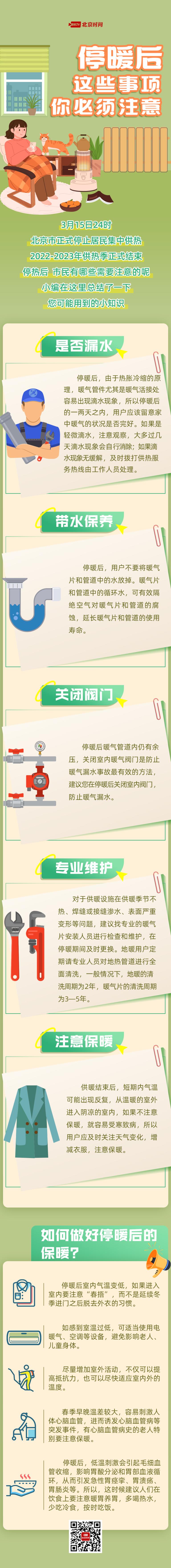 今日(16日)起,北京市正式停止居民集中供熱,都有哪些注意事項(xiàng)?首先要做好供熱設(shè)備的維護(hù),包括及時(shí)檢測(cè)暖氣管道是否漏水,不要放掉暖氣管道中的水,停暖后及時(shí)關(guān)閉室內(nèi)閥門并安排專業(yè)人員對(duì)供暖設(shè)施進(jìn)行維護(hù)和清洗。在停暖后還需注意保暖,如注意“春捂”,增加室外活動(dòng),注重心血管和腸胃的保暖,避免早晚溫差刺激。停暖知識(shí)帖來(lái)了,戳圖了解→