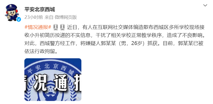 央廣網北京4月3日消息 據北京市公安局西城分局官方微博平安北京西城消息,近日,有人在互聯網社交媒體編造散布西城區多所學校現場接收小升初簡歷投遞的不實信息,干擾了相關學校正常教學秩序,造成了不良影響。