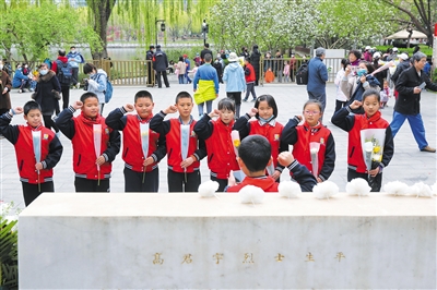 4月5日,陶然亭公園,西羅園第五小學的少先隊員們在高君宇烈士墓前重溫入隊誓詞。新京報記者 王嘉寧 攝