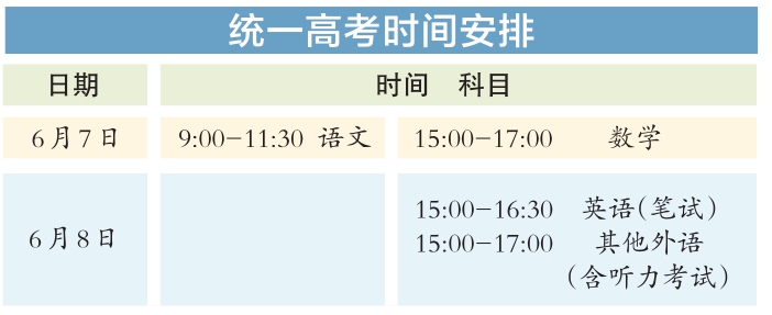 今年統一高考考試科目為語文、數學、外語3門,滿分均為150分。其中,英語聽說考試滿分50分,其他外語(非英語)聽力考試滿分30分,兩次聽說(聽力)考試的最高成績與其他部分試題成績一同組成外語科目成績計入高考總分。學考等級考科目為思想政治、歷史、地理、物理、化學、生物6門,由考生自主選擇3門參加考試,每科目滿分100分。參加本科招生錄取的考生總成績由3門統一高考成績和考生選考的3門學考等級考成績構成,總成績滿分值為750分。