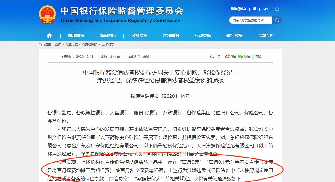 2020年,中國(guó)銀保監(jiān)會(huì)消費(fèi)者權(quán)益保護(hù)局發(fā)布關(guān)于安心財(cái)險(xiǎn)、輕松保經(jīng)紀(jì)、津投經(jīng)紀(jì)、保多多經(jīng)紀(jì)侵害消費(fèi)者權(quán)益案例的通報(bào)。通報(bào)稱檢查發(fā)現(xiàn),上述機(jī)構(gòu)在宣傳銷售短期健康險(xiǎn)產(chǎn)品中,存在“首月0元”“首月0.1元”等不實(shí)宣傳(實(shí)際是將首月保費(fèi)均攤至后期保費(fèi)),或首月多收保費(fèi)等問(wèn)題。上述行為涉嫌違反保險(xiǎn)法中“未按照規(guī)定使用經(jīng)批準(zhǔn)或者備案的保險(xiǎn)條款、保險(xiǎn)費(fèi)率”“欺騙投保人”等相關(guān)規(guī)定。
