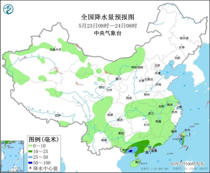 5月23日08時至24日08時,華南南部、臺灣島等地部分地區有中到大雨,其中,廣西東南部沿海等地部分地區有暴雨(50~60毫米)。新疆南疆盆地、青海北部、甘肅河西等地部分地區有4~6級風。東海大部海域、臺灣海峽、臺灣以東洋面將有6~7級、陣風8~9級的風。