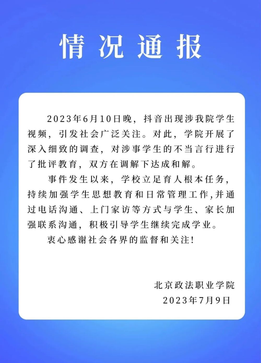 同時,據北京政法職業學院,6月10日晚,抖音出現涉該院學生視頻,引發社會廣泛關注。對此,學院開展了深入細致的調查,對涉事學生的不當言行進行了批評教育,雙方在調解下達成和解。
