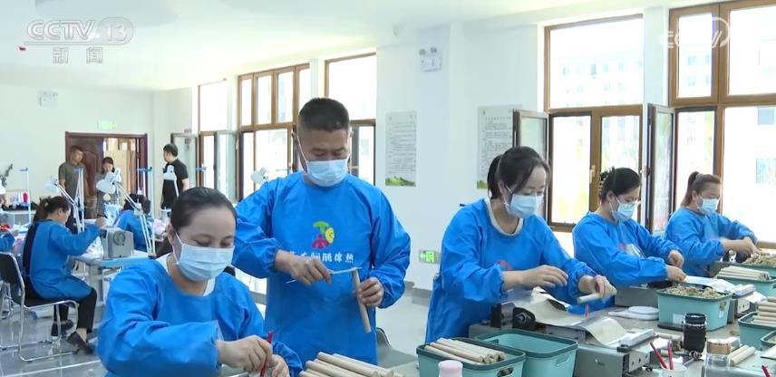 在內蒙古鄂爾多斯市文瀾社區的艾草園創業就業基地,工人們正在加工艾條、艾草枕頭、坐墊、香包等產品。這里的工人都是文瀾社區的居民。