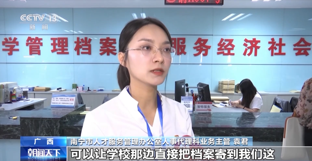 南寧市人才服務管理辦公室人事代理科業務主管 袁君:可以讓學校那邊直接把檔案寄到我們這,我們進行一個免費的托管,不需要學生本人再提供任何的工作材料到現場或者是在網上再辦理任何檔案接收手續。