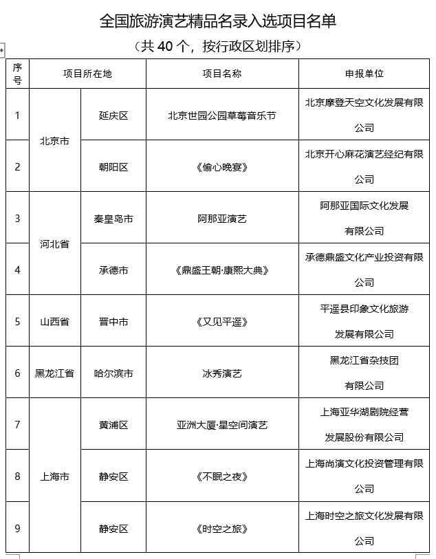 央廣網北京9月27日消息 據文化和旅游部網站消息,為堅持以文塑旅、以旅彰文,推進文化產業和旅游產業深度融合發展,根據《文化和旅游部產業發展司關于開展全國旅游演藝精品名錄申報工作的通知》部署,在各省級文化和旅游行政部門推薦申報基礎上,經專家評審和綜合研究,文化和旅游部產業發展司確定了全國旅游演藝精品名錄入選項目名單,現予以公布。