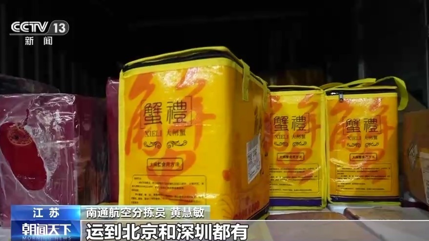 南通航空分揀員 黃慧敏:這批是來的鎮江郭莊來的大閘蟹,已經開始分揀了,運到北京和深圳都有。
