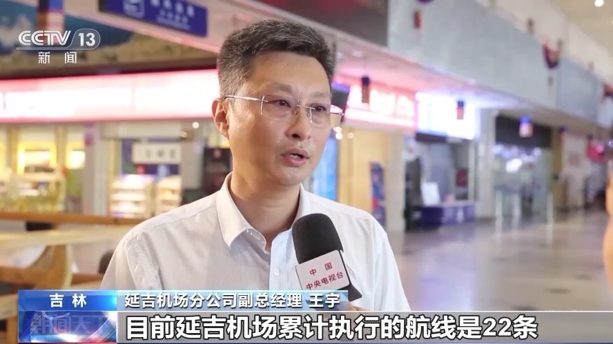 延吉機場分公司副總經理 王宇:目前延吉機場累計執行的航線是22條,國內航線18條,國際航線4條。每周能達到對韓國的航線84班,對韓國的航班量位居東北的第一位。