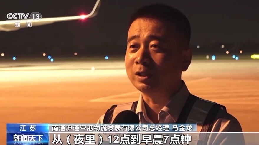 南通滬通空港物流發展有限公司總經理 馬金龍:從夜里12點到早晨7點鐘,陸續有8個航班離港,目的站主要是廣州、深圳、北京幾個機場。