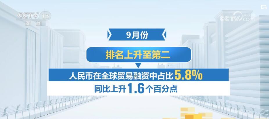 伴隨著中國金融業對外開放持續深化,人民幣國際化水平持續提升。從貿易看,今年1—9月,貨物貿易中人民幣結算的占比達到了24.4%,同比上升7個百分點,為近年來最高水平。與此同時,人民幣融資貨幣功能穩步提升。9月份,人民幣在全球貿易融資中占比為5.8%,同比上升1.6個百分點,排名上升至第二。目前,全世界有80多個國家和經濟體將人民幣納入儲備貨幣。