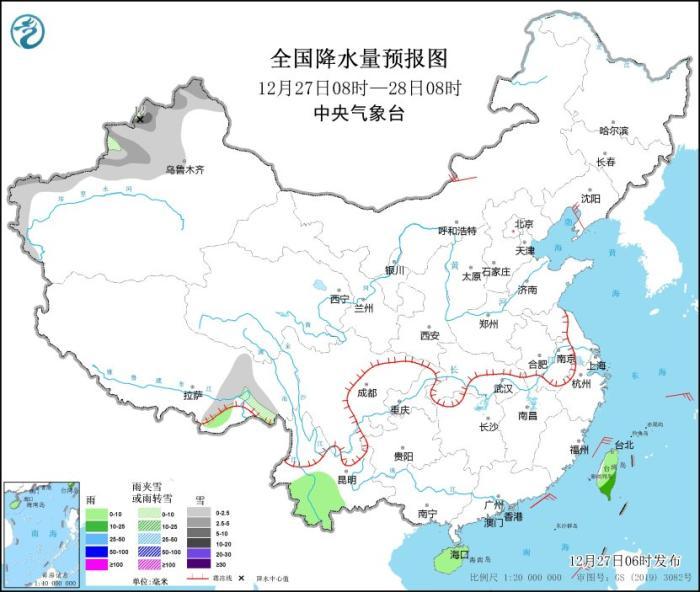 圖1 全國降水量預報圖(12月27日08時-28日08時)