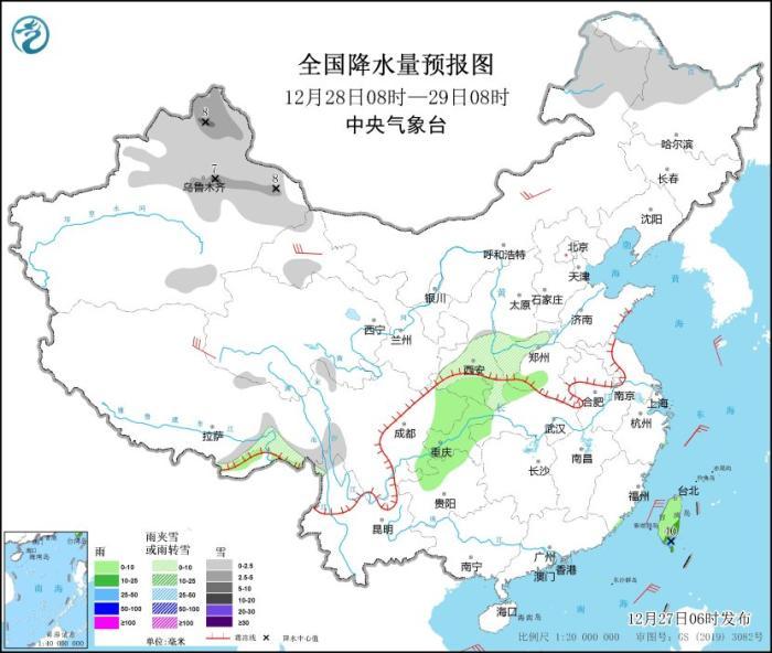 12月28日08時至29日08時,新疆北部、內蒙古東北部、黑龍江西北部、西藏東南部、陜西中部等地部分地區有小雪或雨夾雪,其中,新疆沿天山地區和北疆北部等地部分地區有中到大雪(5~8毫米)。陜西南部、河南南部、西南地區東部、臺灣島等地部分地區有小到中雨,其中,臺灣島東部和南部等地部分地區有大雨(25~40毫米)。青海西部、甘肅河西、內蒙古中部等地部分地區有5~6級風(見圖2)。