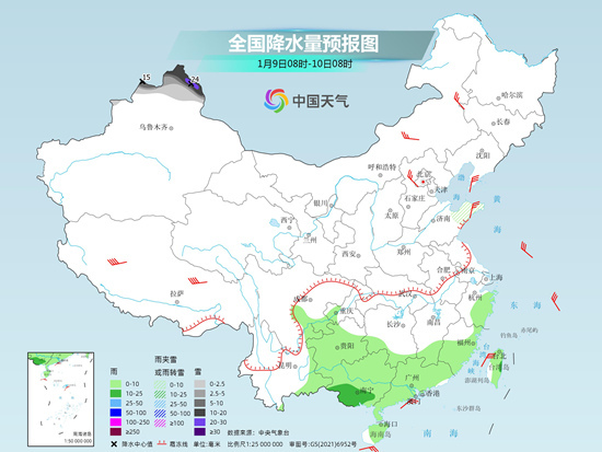 具體來看,今天新疆北疆北部、山東半島等地有小到中雪或雨夾雪,其中新疆阿勒泰、塔城的部分地區有大到暴雪,局地大暴雪(20~24毫米);四川盆地南部、貴州、江南南部和東部、華南、臺灣島等地有小雨,其中廣西南部等地的部分地區有中雨。