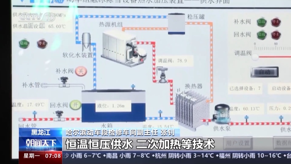 哈爾濱動車段檢修車間副主任 張釗:設備的迭代主要體現在集中適時加熱、恒溫恒壓供水、二次加熱等技術,能夠滿足整列動車組清冰除雪需求。