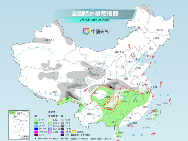 今天(2月23日),我國中東部等地大范圍雨雪持續,降水強度繼續減弱,不過陜西南部、湖北東部和南部等地部分地區仍有大雪,局地暴雪,湖南、貴州等地有凍雨。明后天,北方大部降雪停歇,南方仍有雨雪天氣。預計南方多陰雨的天氣格局將延續至月底,大部地區氣溫也持續低迷,公眾春運出行需注意防范。