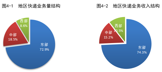 1-2月,東、中、西部地區(qū)快遞業(yè)務(wù)量比重分別為72.9%、18.5%和8.6%,業(yè)務(wù)收入比重分別為74.3%、15.2%和10.5%。與去年同期相比,東部地區(qū)快遞業(yè)務(wù)量比重下降2.2個(gè)百分點(diǎn),快遞業(yè)務(wù)收入比重下降1.2個(gè)百分點(diǎn);中部地區(qū)快遞業(yè)務(wù)量比重上升1.5個(gè)百分點(diǎn),快遞業(yè)務(wù)收入比重上升0.7個(gè)百分點(diǎn);西部地區(qū)快遞業(yè)務(wù)量比重上升0.7個(gè)百分點(diǎn),快遞業(yè)務(wù)收入比重上升0.5個(gè)百分點(diǎn)。