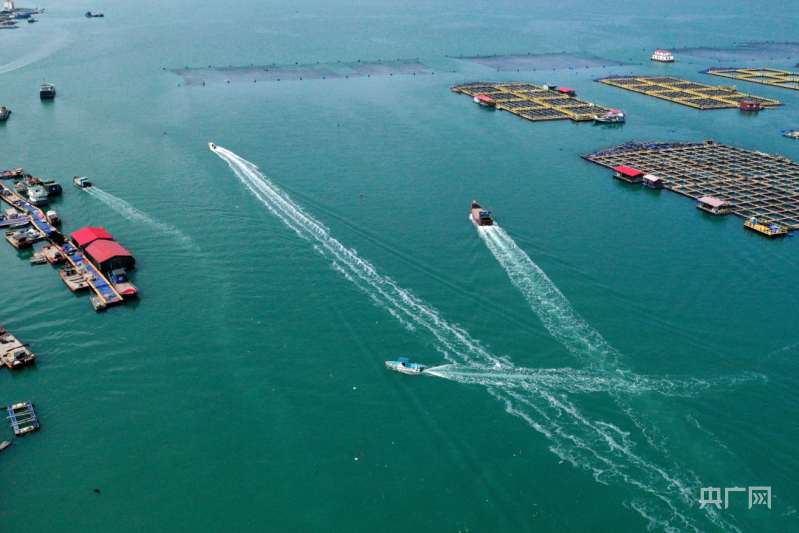 養殖工人駕駛漁船在養殖區穿梭(央廣網發 王旺旺 攝)